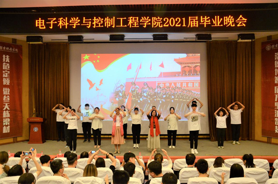 随后由主持人宣布大会第二项内容毕业礼正式开始。首先是贾甚杰老师和朱桃花老师与学院团总支·创新创业联盟的学生干部们一起表演的传统手语舞《国家》,表达了对家国的热爱。随后由学院党支部带来的朗诵《永远跟党走》则是体现了大家对中国共产党的尊敬和拥护。接着我院学生会的合唱《遥远的你》,电子青年科技联盟与文艺联盟一起带来的朗诵《青春万岁》,把毕业的气氛推向高潮,展现了后浪的朝气蓬勃。随后,在中场毕业纪念视频中,毕业生们回忆起了自己大学四年的时光,仿佛随着那些照片视频回到了最初的时候。视频结束后则是各个毕业班级表演的最后的节目。有激动人心的舞蹈串烧,反响热烈的歌曲《see you again》,感慨万千的大合唱《没有什么不同》,节奏明快的爵士,搞笑轻松的山东快书,拨动心弦的独唱《昨日晴空》。