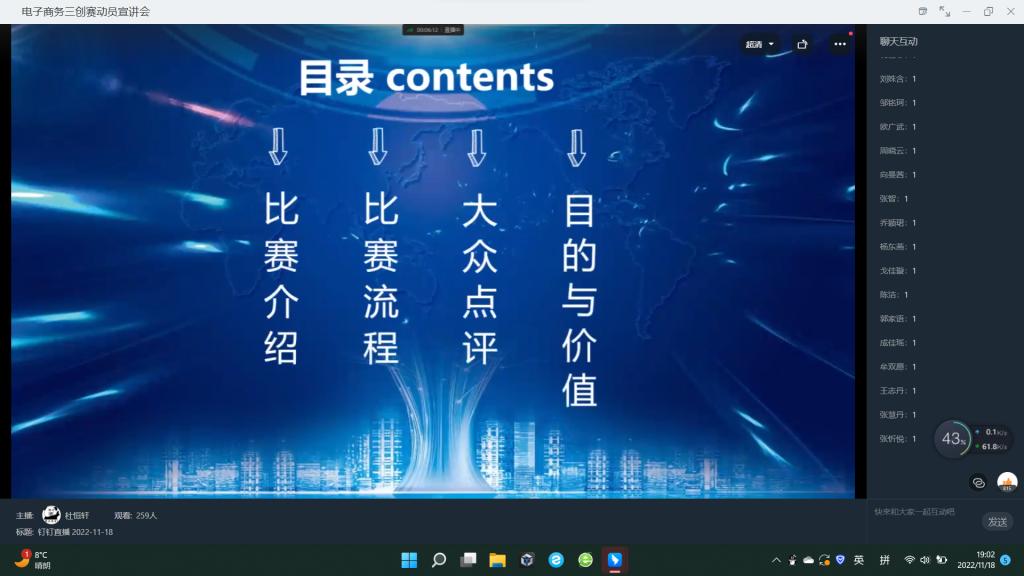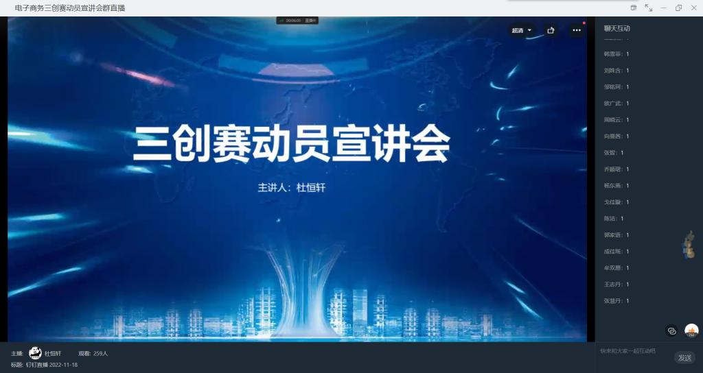 全国大学生电子商务“创新、创意及创业”挑战赛简称“三创赛”,为使同学们对“三创赛”有更深的了解,提高同学们对“三创赛”的兴趣,培养创新创业意识,创新创业联盟项目实践部于11月18日19点通过钉钉直播的方式举办电子商务“三创赛”动员宣讲会。
