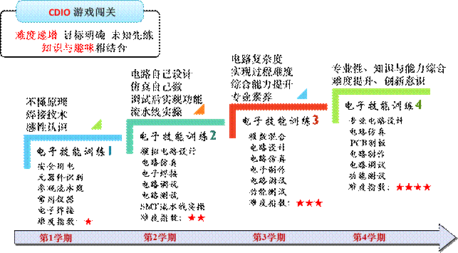 技能训练:涵盖电子技能训练(1)-(4),分别开设在本科第一-第四学期,培养学生从元器件识别、检测、焊接、仿真、装配到设计、制作、调试、测试全过程综合实践能力,以实践两年不断线,推进学科专业发展四年不断线。由浅入深,难度递增,通过不断发现问题、分析问题、解决问题,有效拓展学生知识视野,启迪专业学习兴趣,进一步培养专业综合素质及创新精神。
